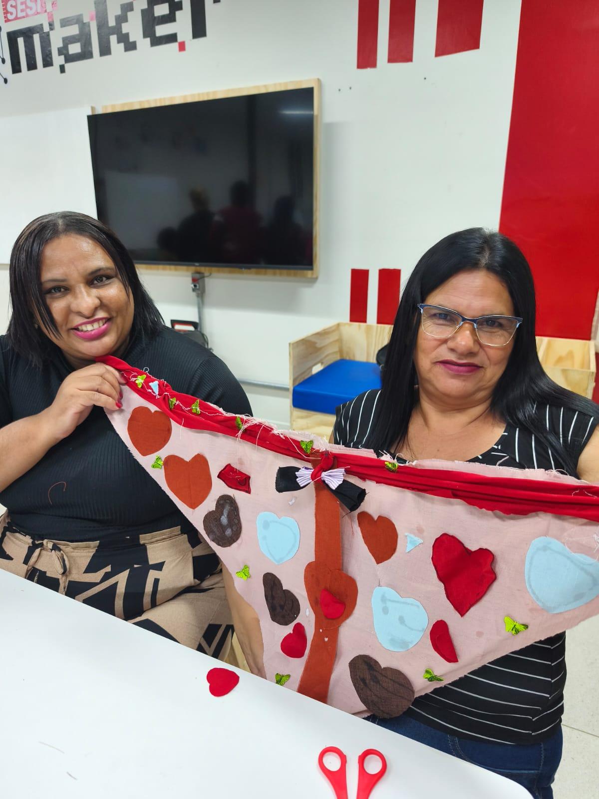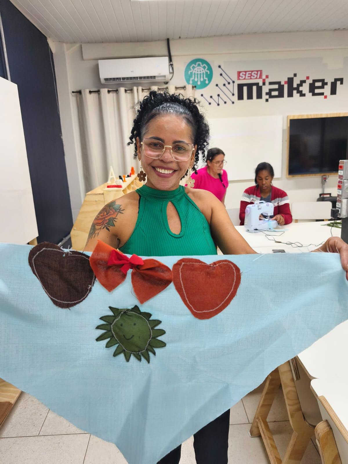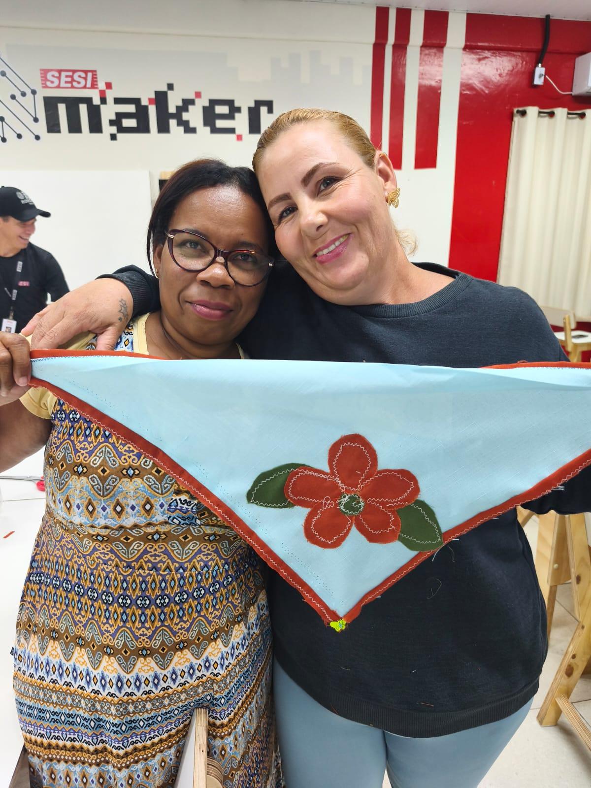 Durante a proposta, os participantes confeccionaram lenços com tecidos, linhas e agulhas, usando o acessório como símbolo para representar suas histórias de vida, trajetórias e desafios superados.