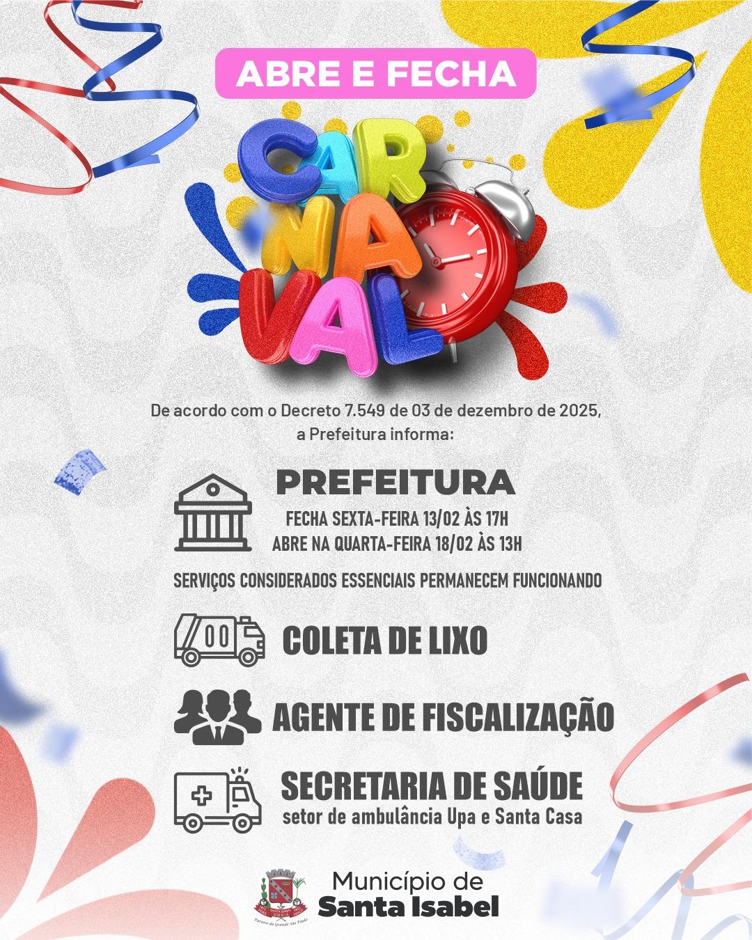 A Prefeitura de Santa Isabel terá alteração no funcionamento dos serviços administrativos durante o período de Carnaval, conforme previsto no Decreto nº 7.549, de 3 de dezembro de 2025.