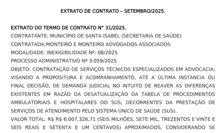 A Prefeitura de Santa Isabel, por meio da Secretaria de Saúde, firmou um contrato com o escritório Monteiro e Monteiro Advogados Associados para tentar recuperar valores não repassados ao município pelo Sistema Único de Saúde (SUS). O extrato foi publicado no Boletim Oficial desta quarta-feira (24).