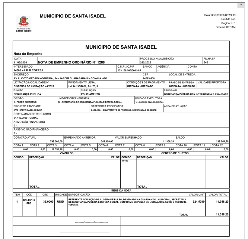 A Prefeitura de Santa Isabel realizou a compra de algemas destinadas à Guarda Civil Municipal (GCM), conforme consta em documento oficial de empenho emitido no dia 11 de março de 2026. De acordo com a Nota de Empenho nº 1266, o valor total da aquisição é de R$ 11.358,20, referente à compra de 35 unidades do equipamento, com valor unitário de R$ 324,52.